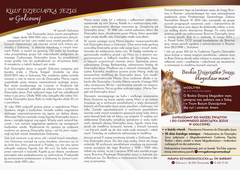 2. W ubiegłą niedzielę w naszej wspólnocie parafialnej przeżywaliśmy piękną uroczystość dziękczynną za 100 lat kultu Dzieciątka Jezus w naszej świątyni. Uroczystej Mszy św. dziękczynnej o godz. 10.30 przewodniczył ks. Biskup Krzysztof Chudzio. Dziękuję wszystkim, którzy w jakikolwiek sposób włączyli się w przygotowania i przeżywanie tej uroczystości. Dziękuję ks. Wikariuszowi, p. katechetce, p. kościelnemu, p. organistce, chórowi i służbie liturgicznej. Dziękuję Bractwu Dzieciątka Jezus za posprzątanie kościoła, ufundowanie kwiatów i ornatu. Dziękuję za złożone ofiary na nowy nagrobek śp. Marii od Dzieciątka Jezus. Dziękuję wszystkim parafianom i pielgrzymom z poza parafii, którzy brali udział w tej uroczystości. Niech nasze cudowne Dzieciątko Jezus wszystkim błogosławi. Naszą uroczystość transmitowało Radio i Telewizja Fara, a także p. Andrzej przez naszą stronę internetową. I tam, na stronie naszej parafii można znaleźć linki, gdzie możemy ponownie oglądnąć te transmisje, czy polecić innym.